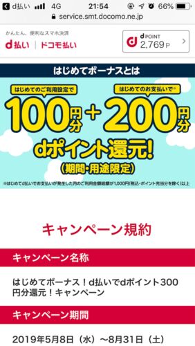 d払いで、初めて利用キャンペーン中! service.smt.docomo.ne.jp 300ポイントもらえますよ。ちなみにドコモユーザーじゃなくてもd払いは利用できます。 まだの方、良かったらお試しください