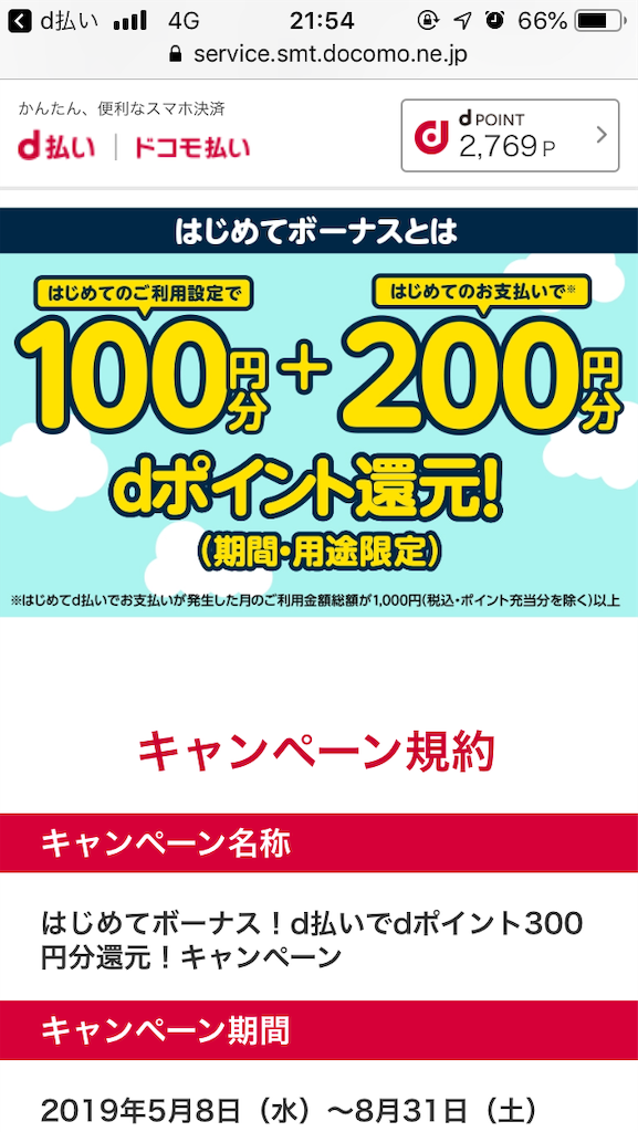 2019-05-14 d払い 初めて利用キャンペーン キャンペーン情報・お小遣い稼ぎ d払いで、初めて利用キャンペーン中! service.smt.docomo.ne.jp 300ポイントもらえますよ。ちなみにドコモユーザーじゃなくてもd払いは利用できます。 まだの方、良かったらお試しください
