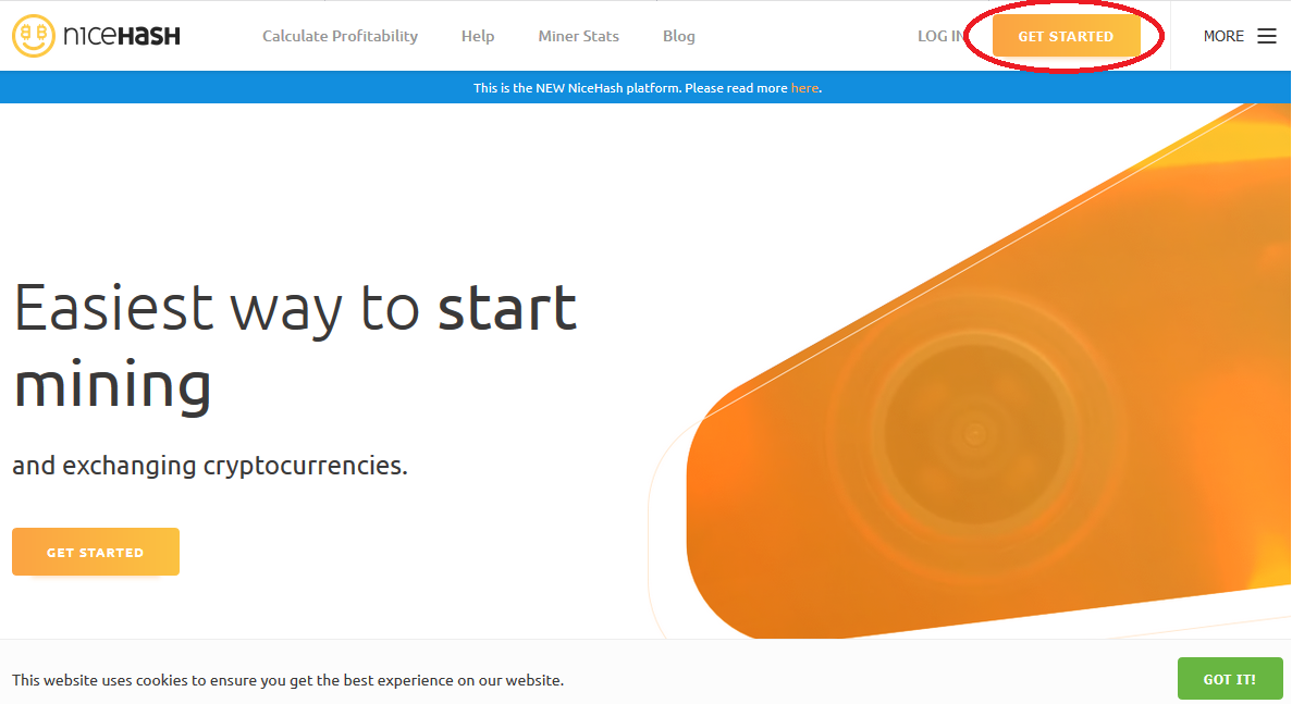公式ホームページNiceHash - Largest Crypto-Mining Marketplaceにアクセスして、右上の「GET STARTED」をクリックします。