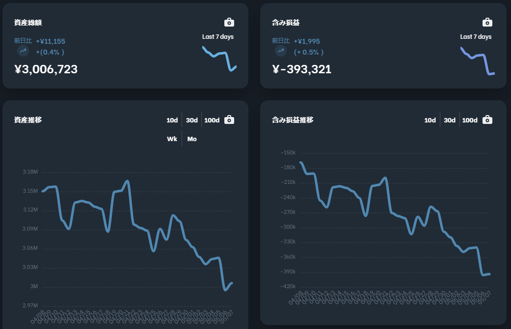 毎月1万円積み立て、リスク許容度5です。先週から含み益が3千円減ってました。