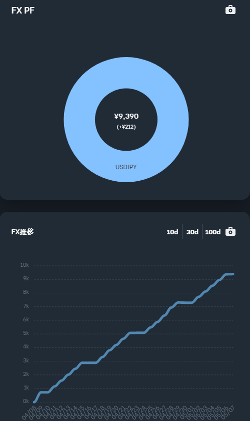 積立FXで毎日ドル円を約3ドル分(レバレッジ3倍)買っています。たまにスワップ分が自動再投資されます。良い感じ。
