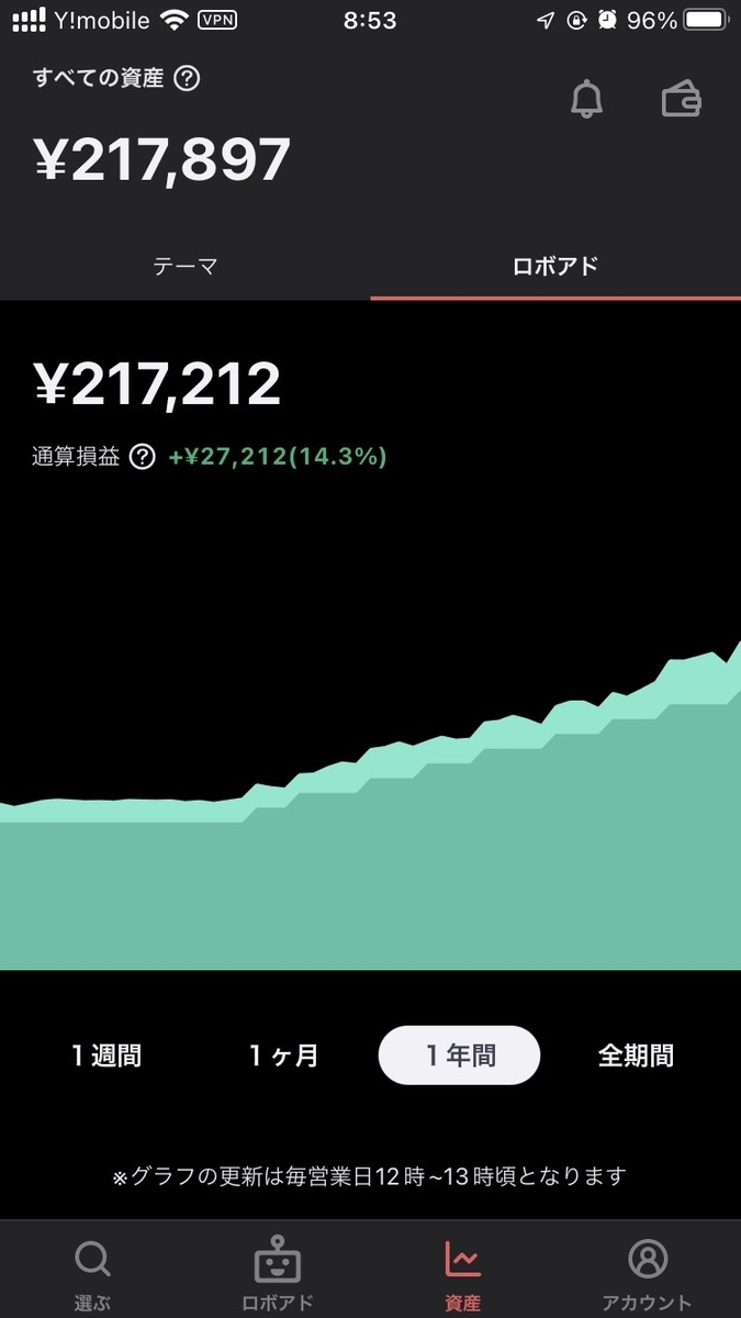 毎月1万円自動積立中です。さすがに先週より含み益が6千円減っていました。月例のリバランスがあって、VTI比率が22.3%→38.0%に増えていて、ハイイールド債、新興国株、先進国株の比率が減っていました。どうやらロボプロさんは米株は反発を予想しているようですね。