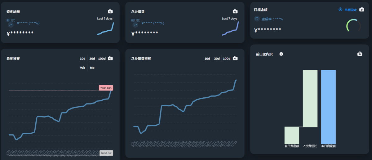 先週より+13万円。オルカンの定期積立を毎日2100円ほどやってます。入金分を差し引いても+12万円増。ドル高の恩恵ですね。tsumiki証券のセゾングローバルファンドがやっとプラテンしました。