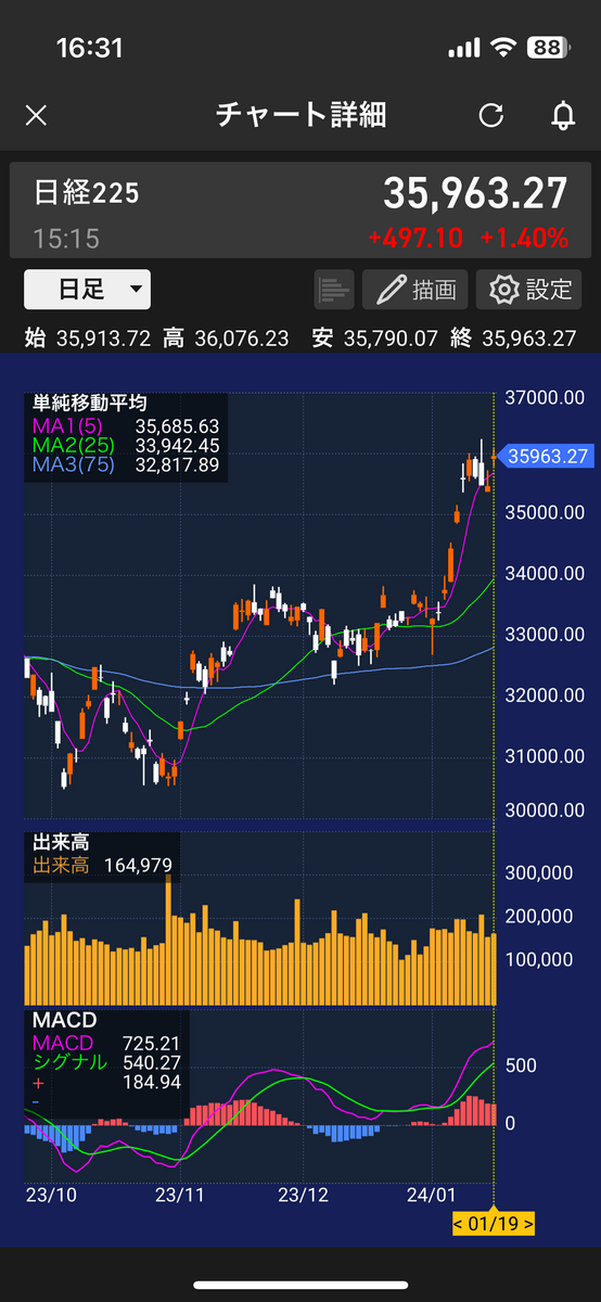 こやつは日経平均が下がると2倍上がるというレバレッジ商品でして、つまり日経平均がガンガン上がっているのでどんどん損が広がっているということです。ちなみに日経平均先物がすごいことになってまして・・・。
