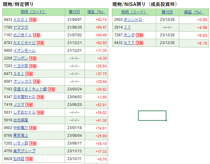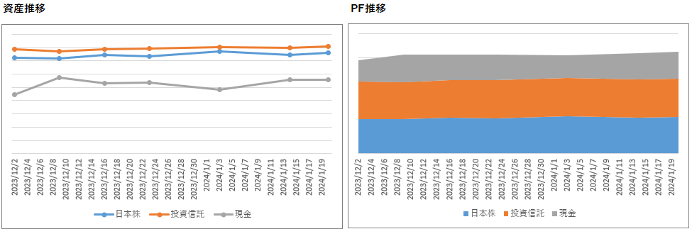 先週から+29万円です。日本株は高配当バリュー株、優待株が主で、新NISAで買われやすい銘柄と思います。恩恵を受けることができました。投資信託は円安が進んだ影響だと思います。