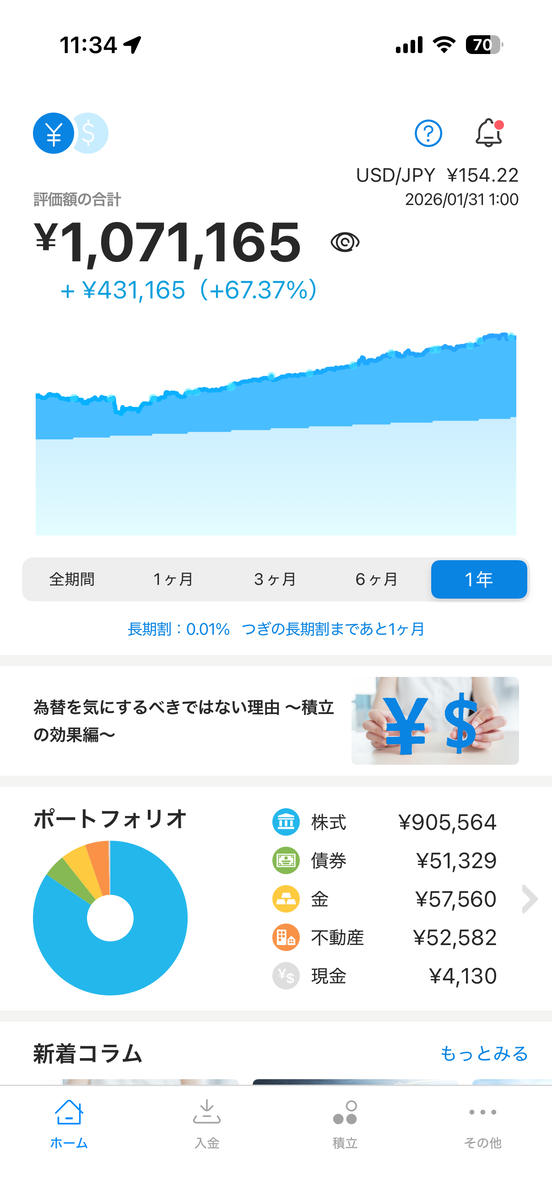 2020年10月から続けてます!現在の元本は64万円。WelthNaviはリスク許容度5です。毎月1万円ずつ自動積立をしています。