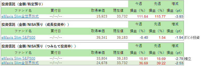 先週から▲800円です。外国株式100%で運用中です。ドル円の下げを喰らっていますね。